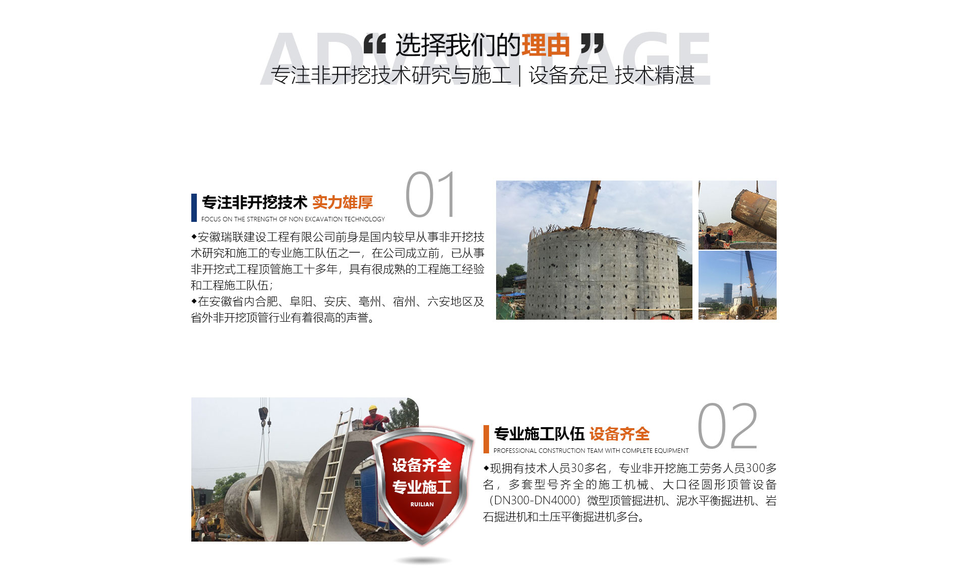 安徽瑞聯(lián)建設工程有限公司前身是國內(nèi)較早從事非開挖技術(shù)研究和施工的施工隊伍之一,在公司成立前,已從事非開挖式工程頂管施工十多年,具有很成熟的工程施工經(jīng)驗和工程施工隊伍,在安徽省內(nèi)合肥、阜陽、安慶、亳州、宿州、六安地區(qū)及省外非開挖頂管行業(yè)有著很高的聲譽。面對日益擴大的市場,公司于2014年正式成立,公司擁有勞務分包及市政公用工程總承包資質(zhì)。公司優(yōu)勢(文字):現(xiàn)擁有中高技術(shù)人員30多名,非開挖施工勞務人員300...